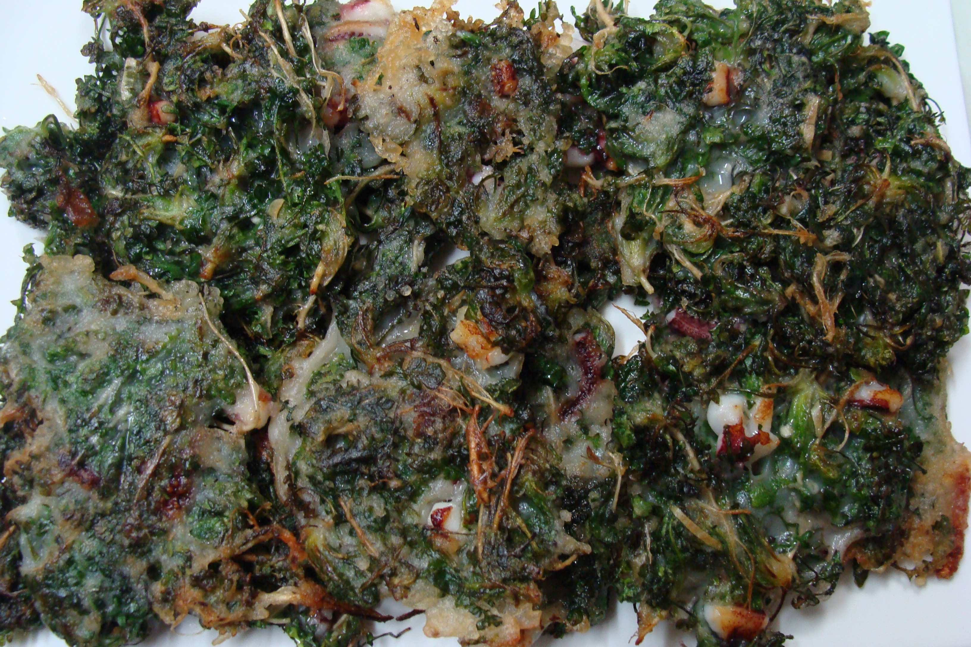 냉이를 안 자르고 부쳤더니 뿌리가 삐쭉 나와서
