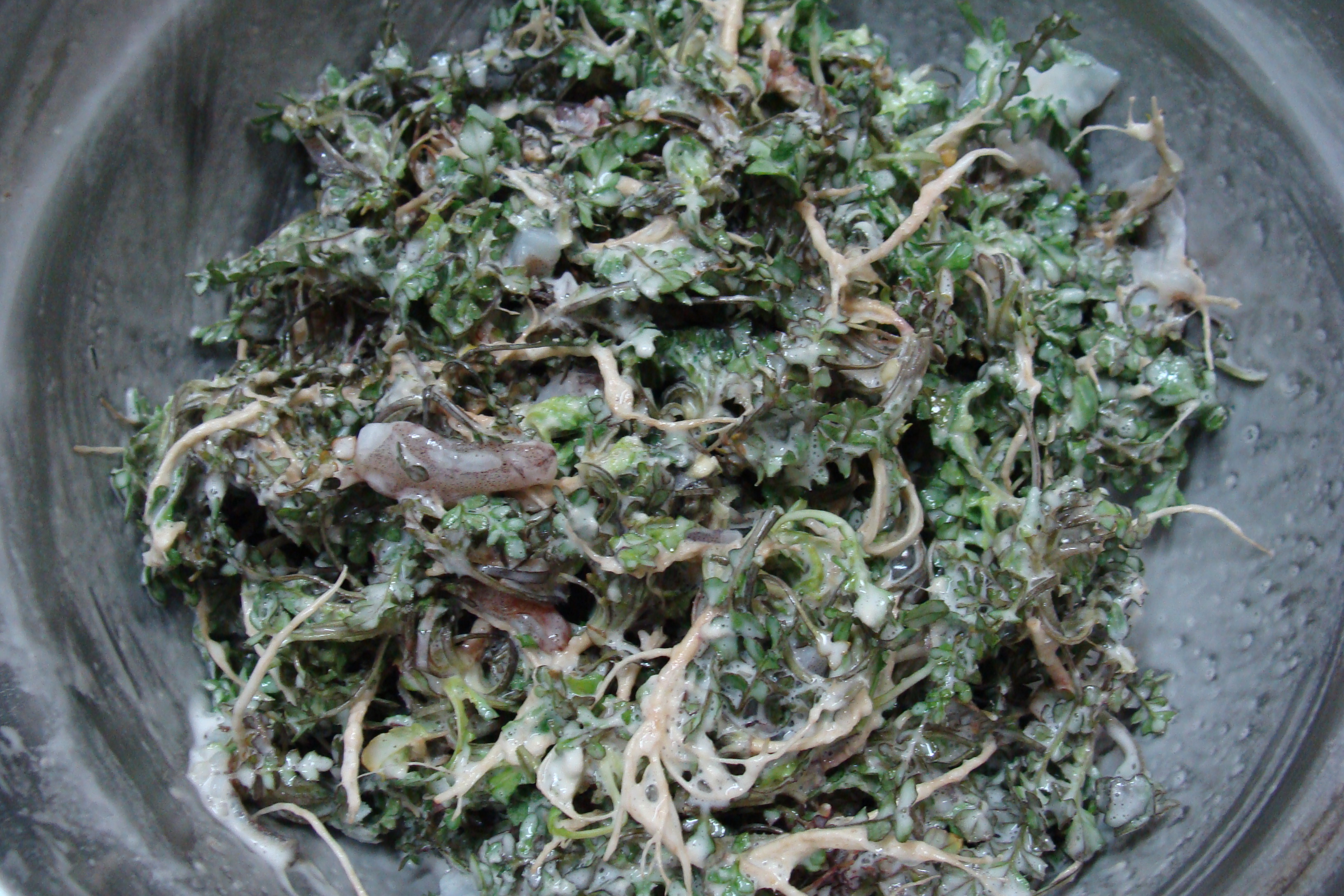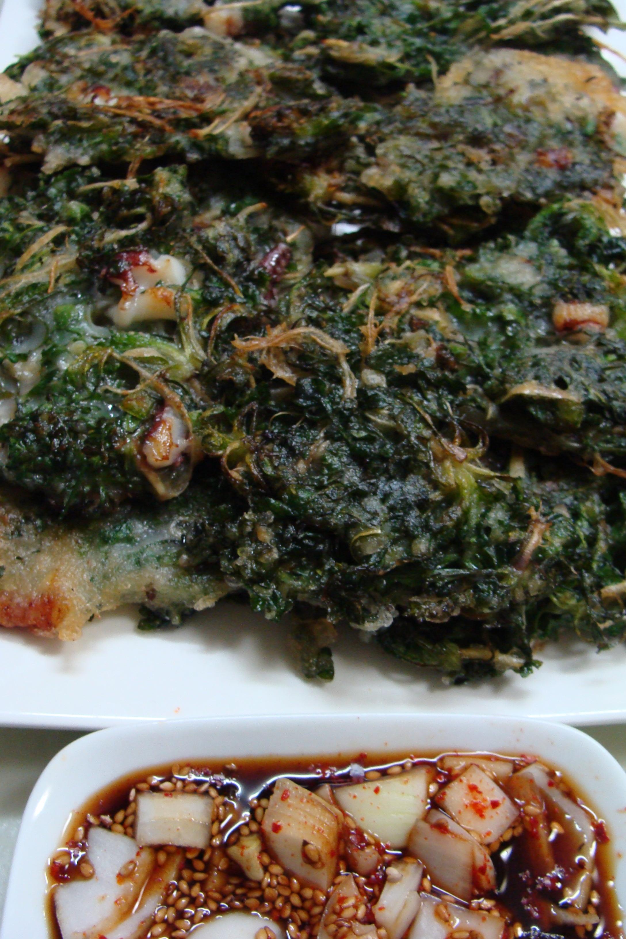 밀가루 반죽에 냉이 청양고추 오징어 넣어주시고