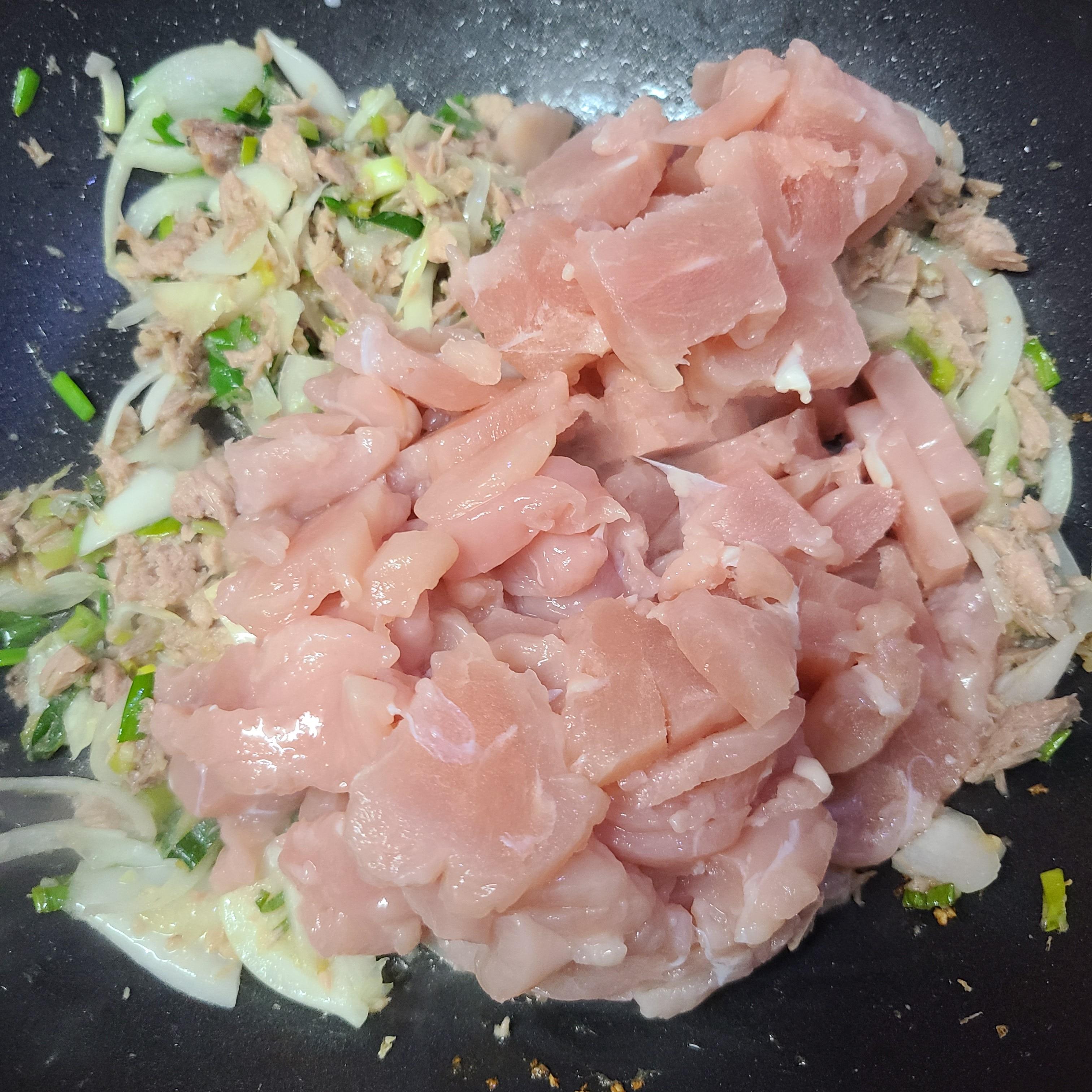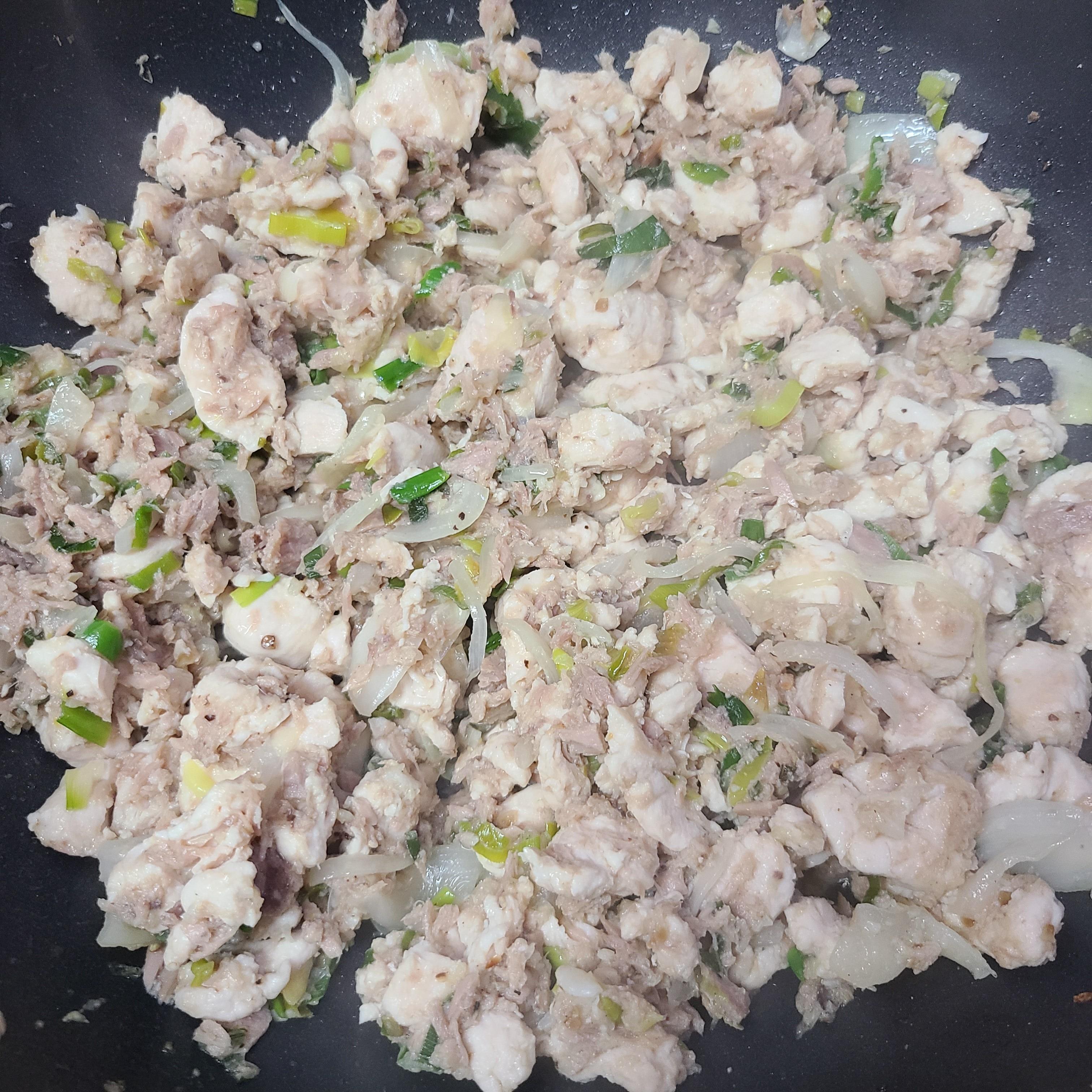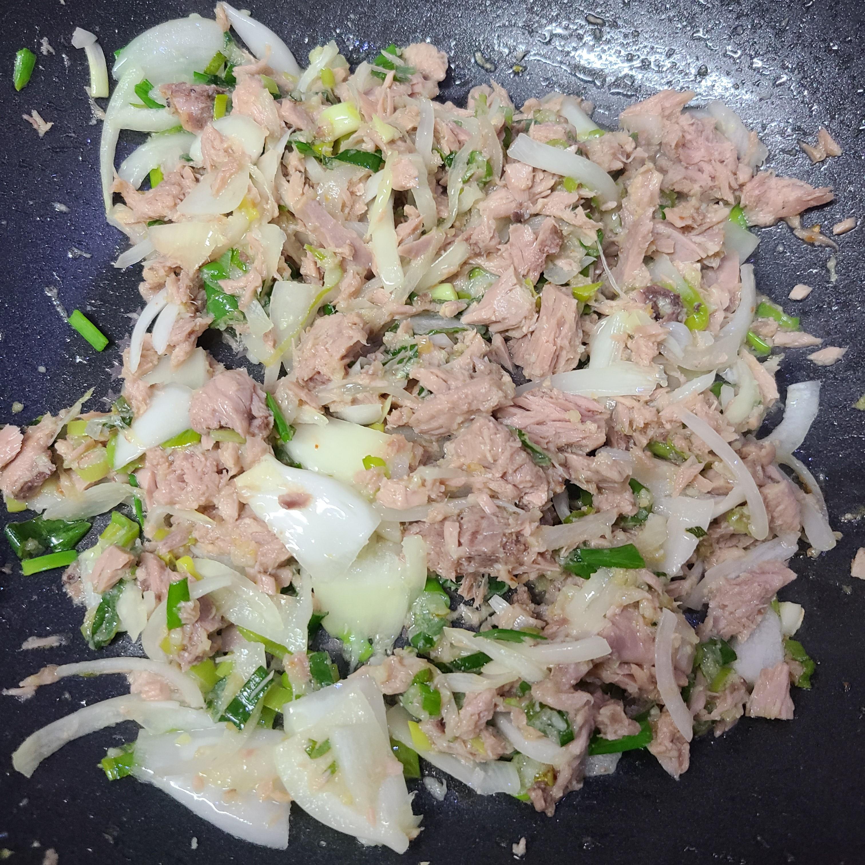 양파와 기름 뺀 참치 넣고 볶아주세요.