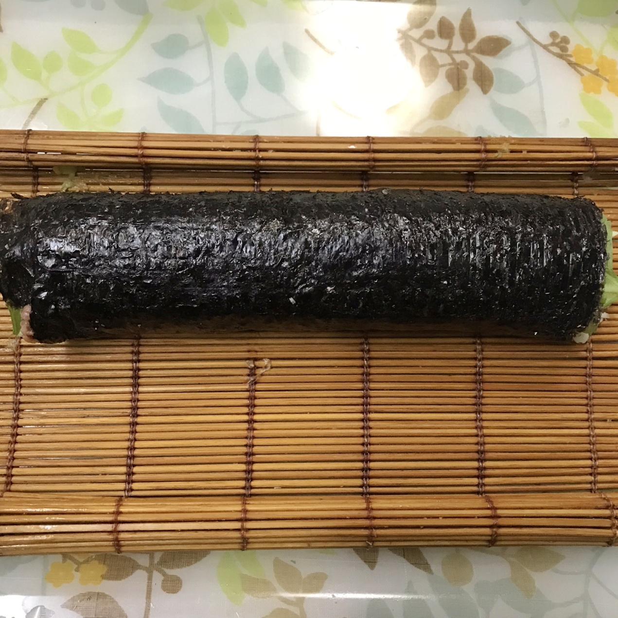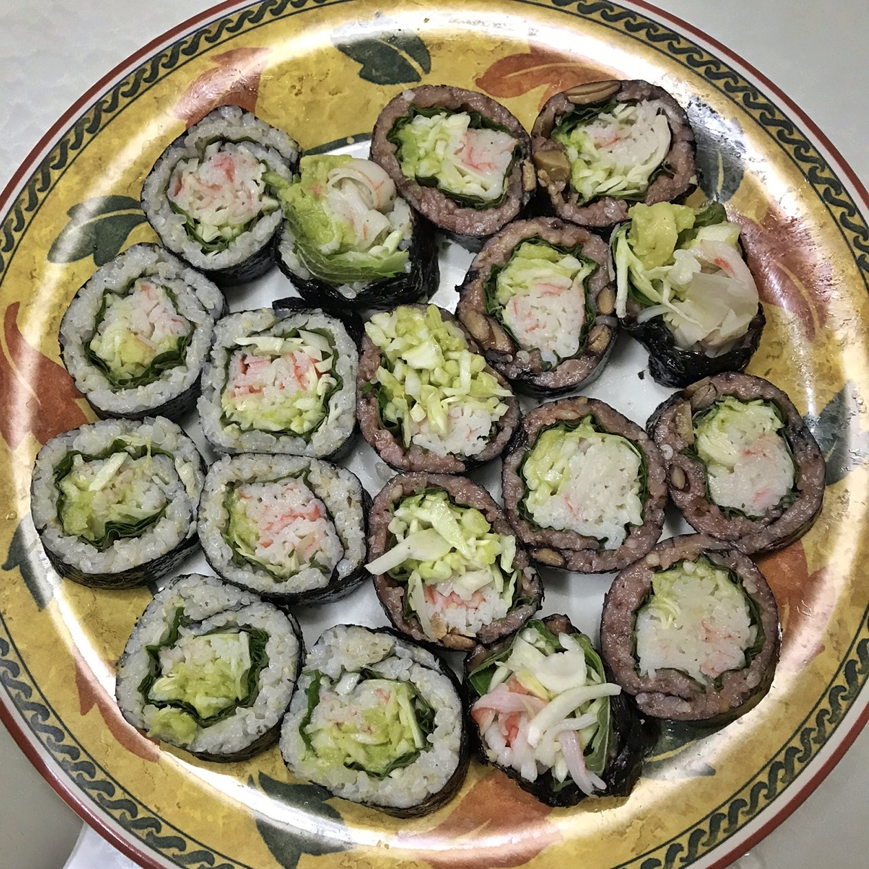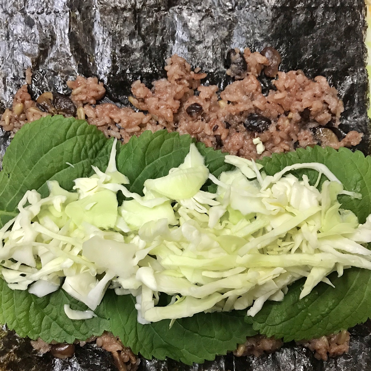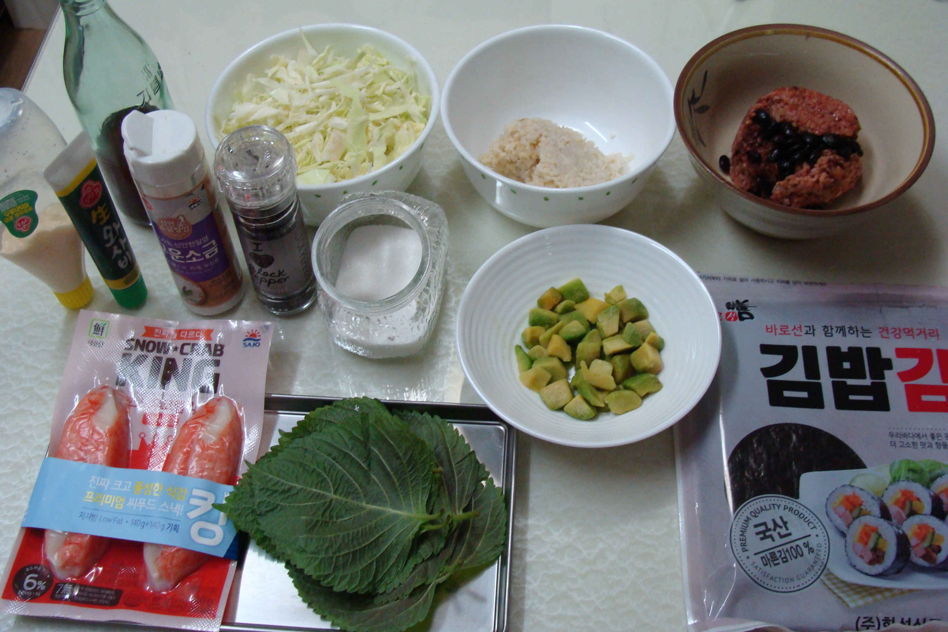 밥 깻잎 아보카도 양배추 크래미 순으로 올려주고 돌돌말아줍니다.