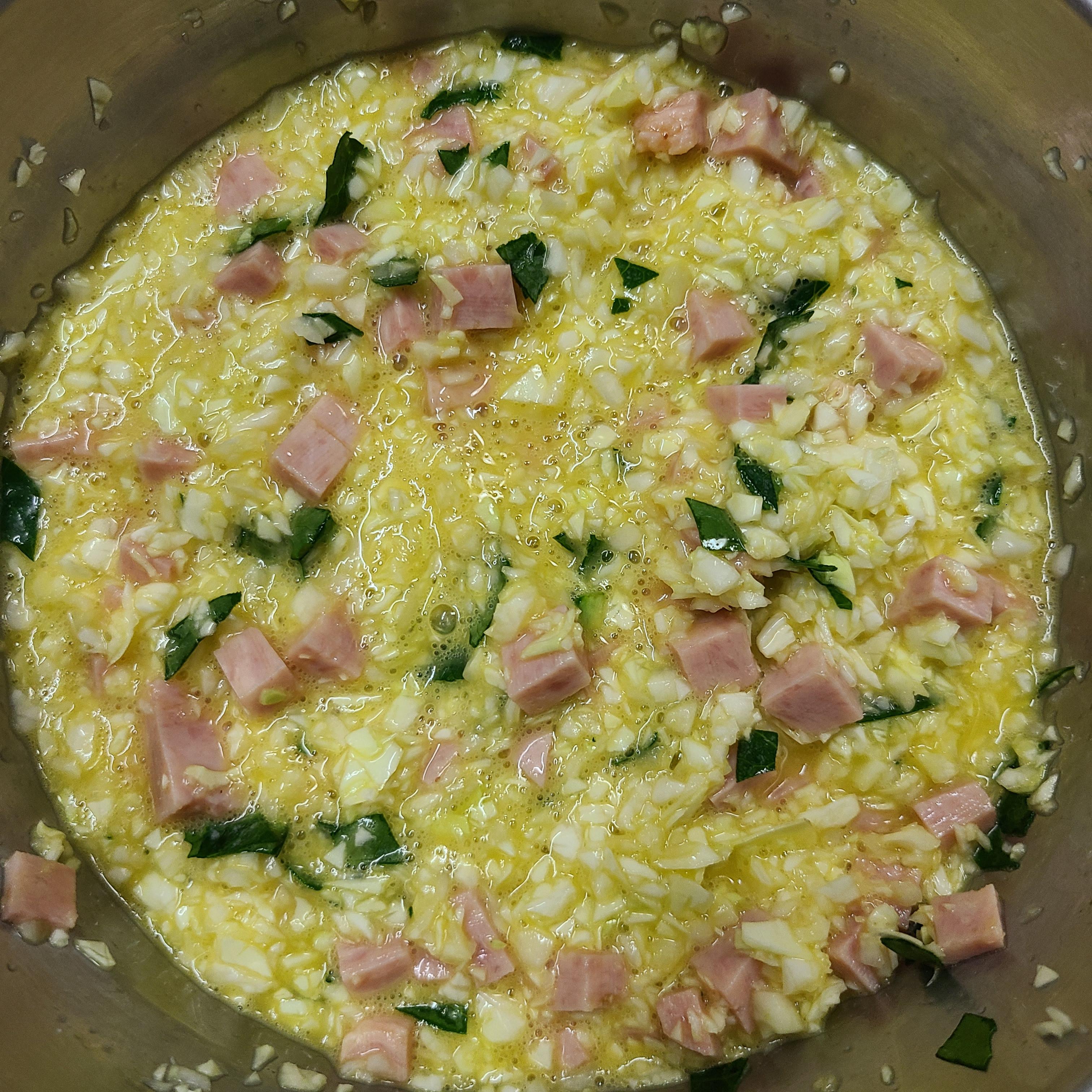 양배추 다지고 스팸, 계란, 케일 자투리 넣고