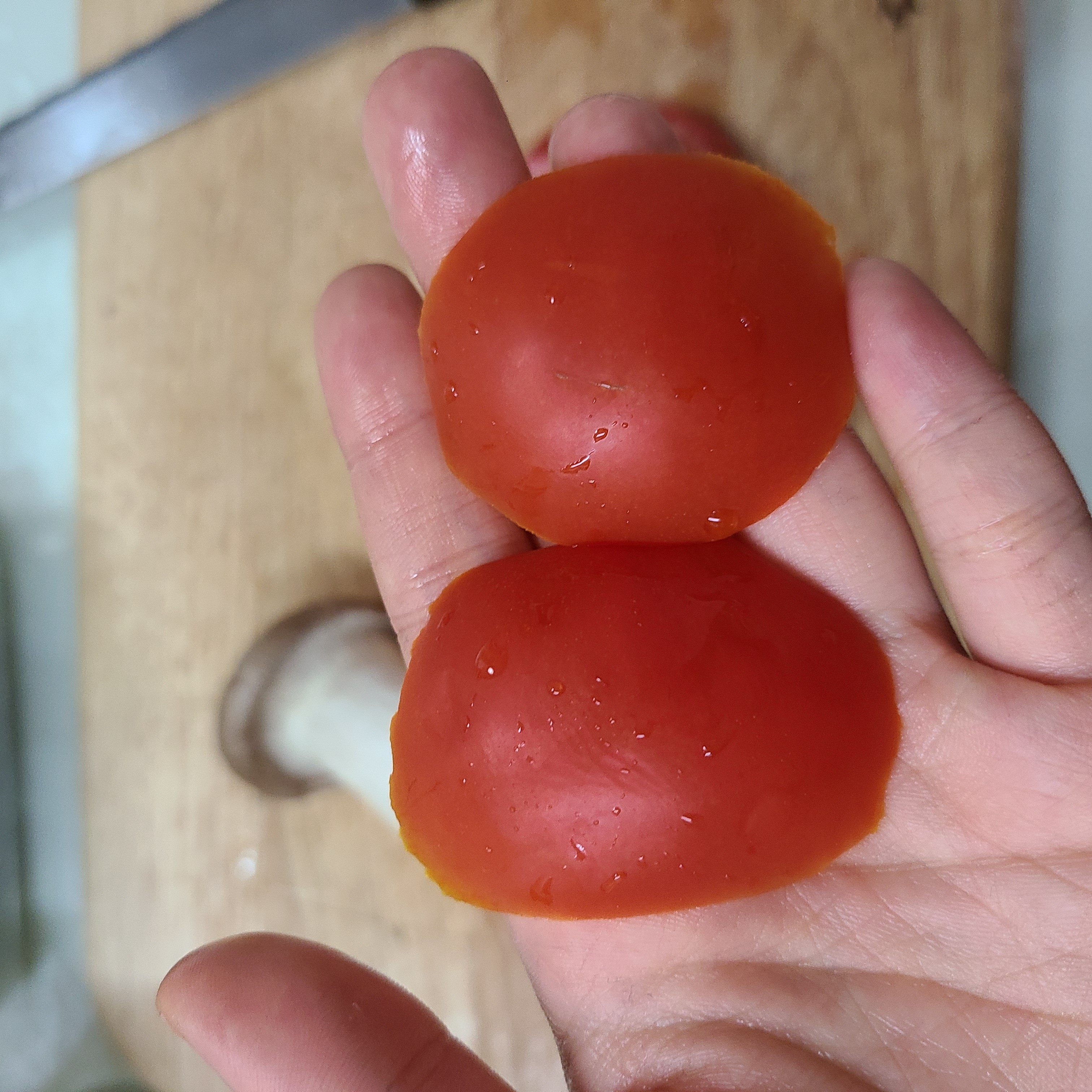 토마토 양쪽 끝은 평평하지가 않아서 쌓기 힘드니까 내 입으로 쏘옥~