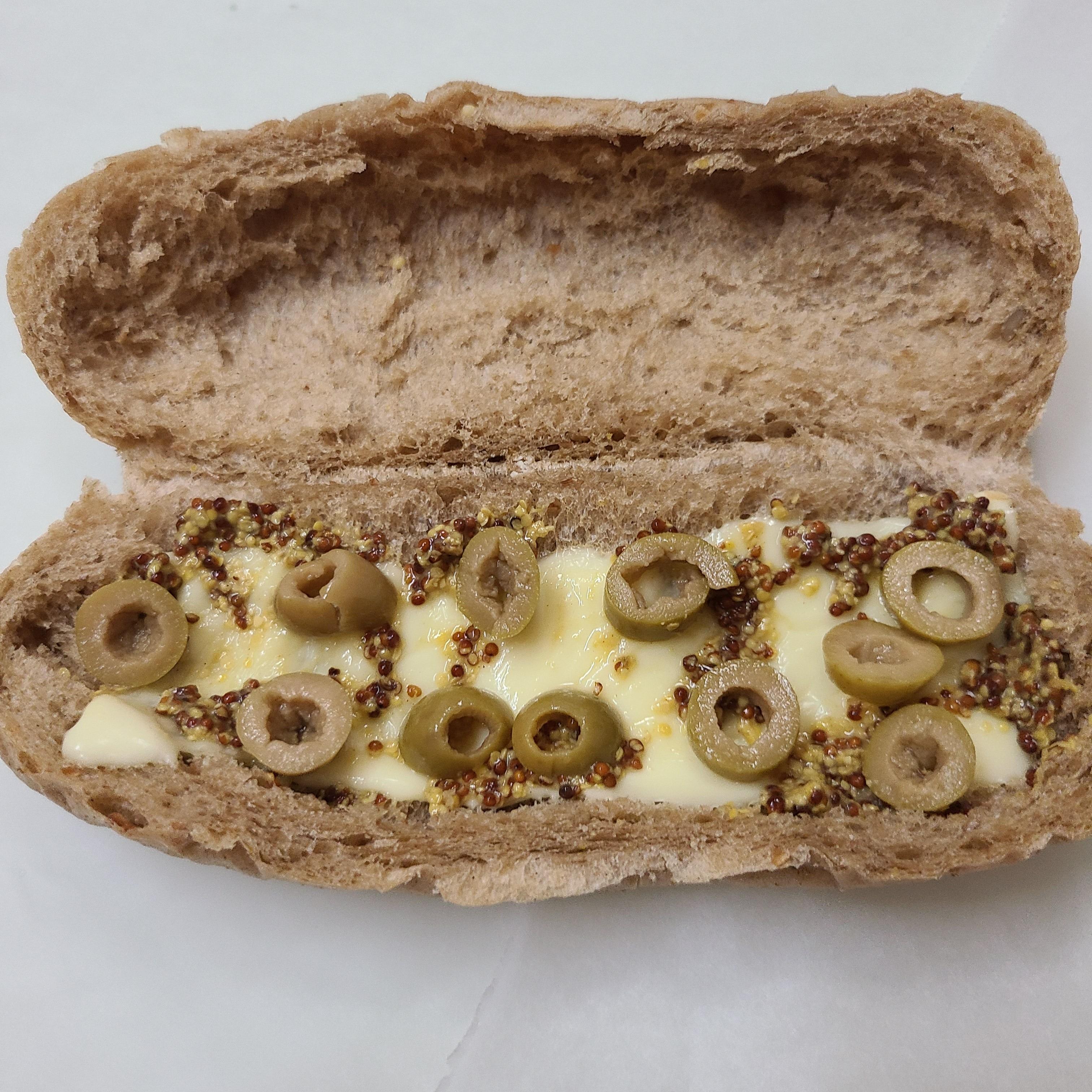 치즈 위에 홀그레인 머스터드 발라주시고 구멍 뚫린 올리브 올려주세요