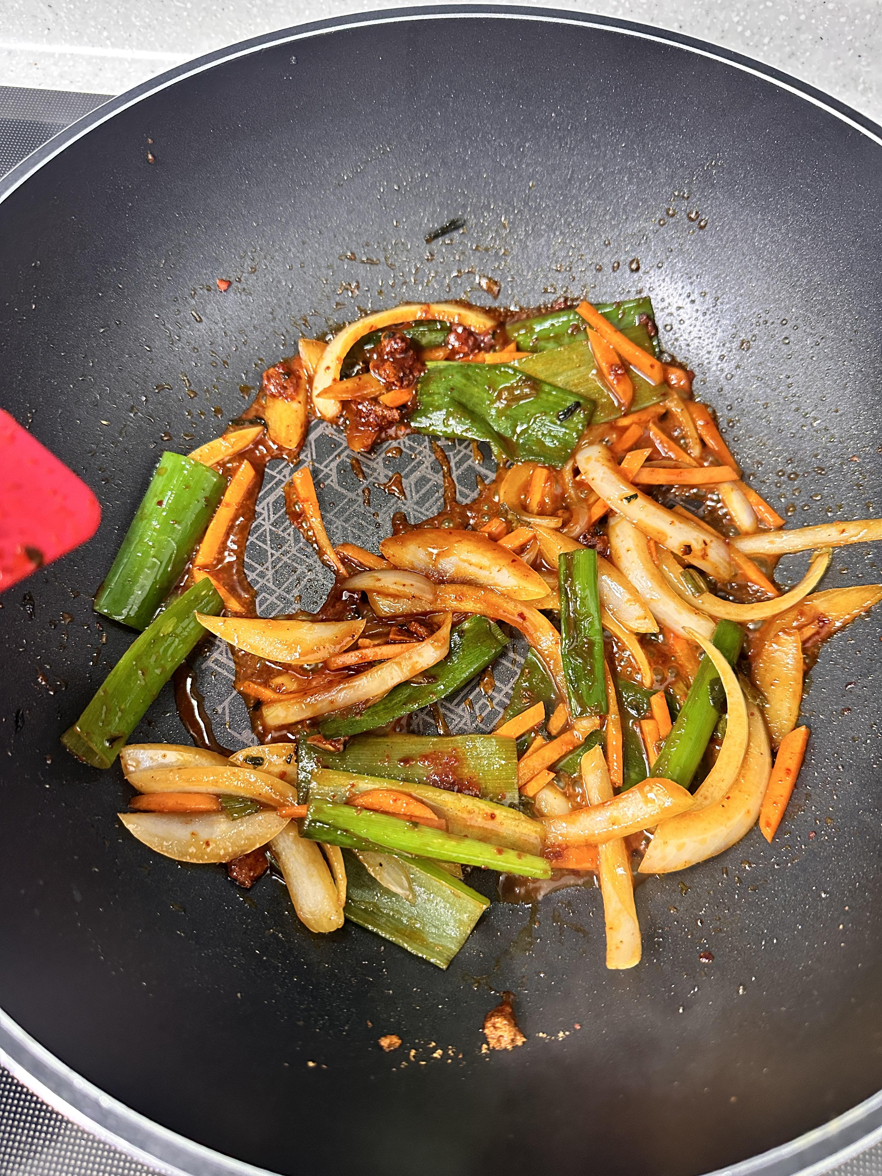 올리브유 두른 팬에 당근, 양파, 파 먼저 볶아주고