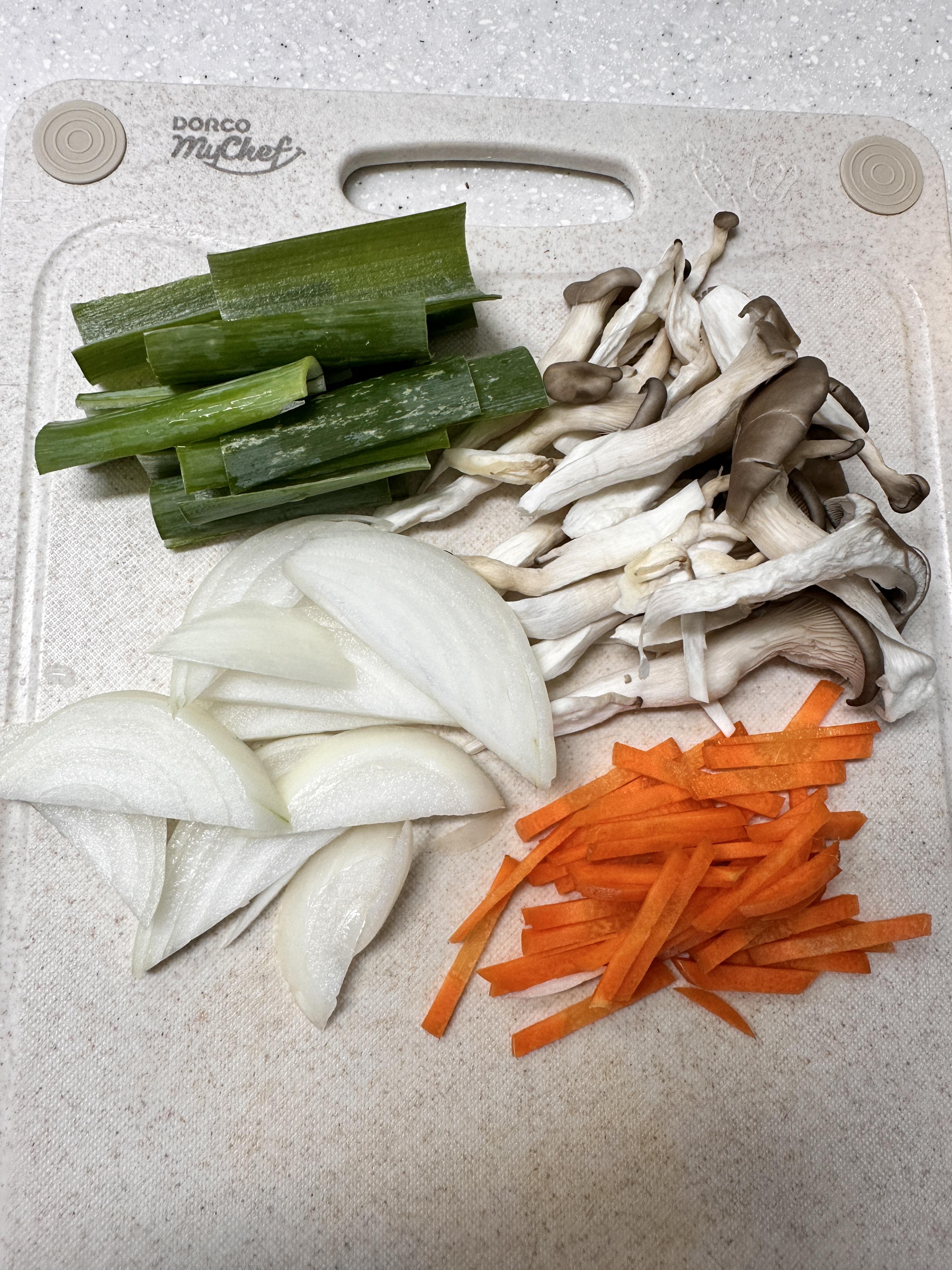 양파, 당근 채 썰고 파는 길게 썰어주세요.