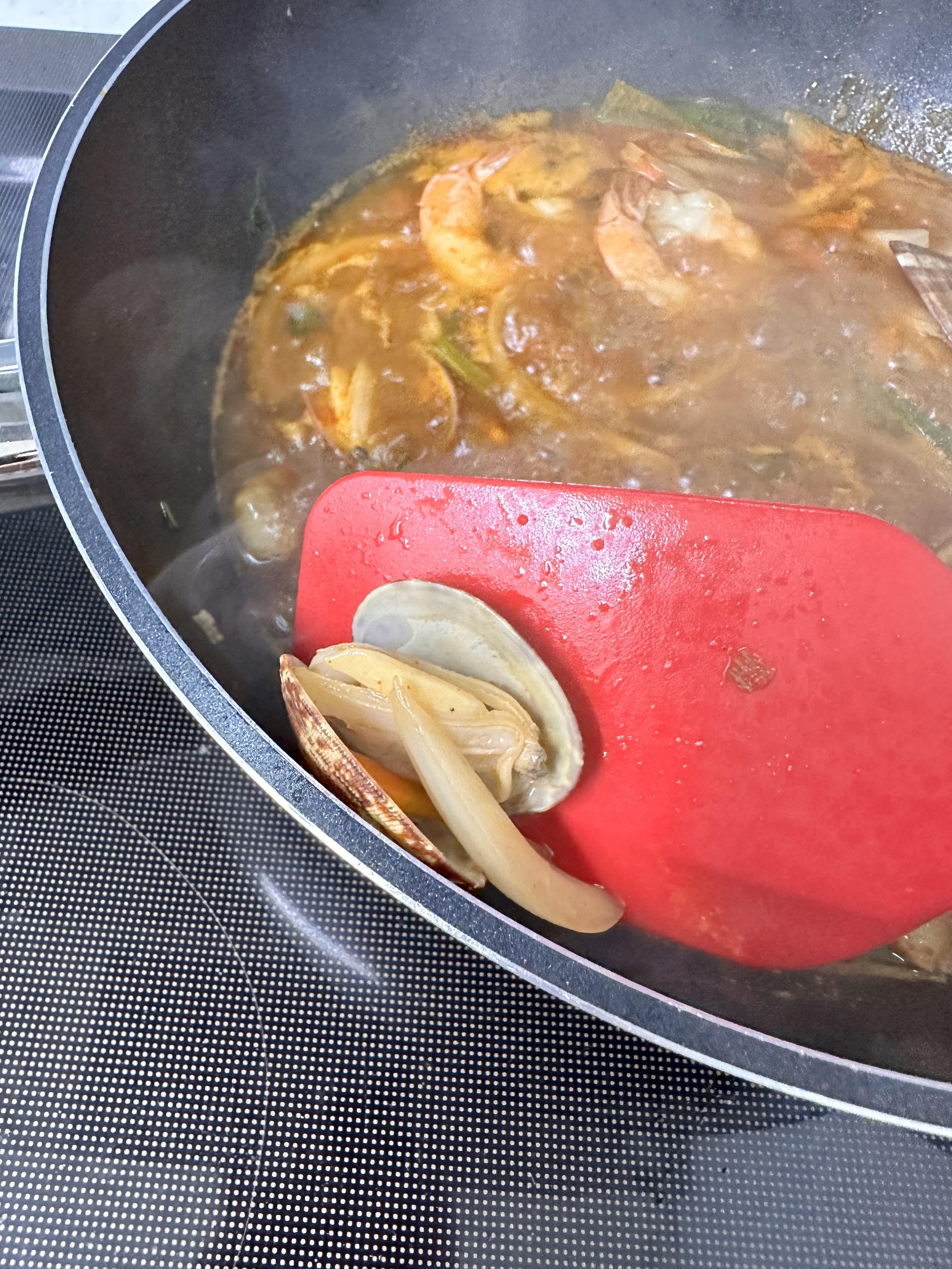 간장 1/2스푼, 물 500ml, 새우랑 해물 넣어주세요.