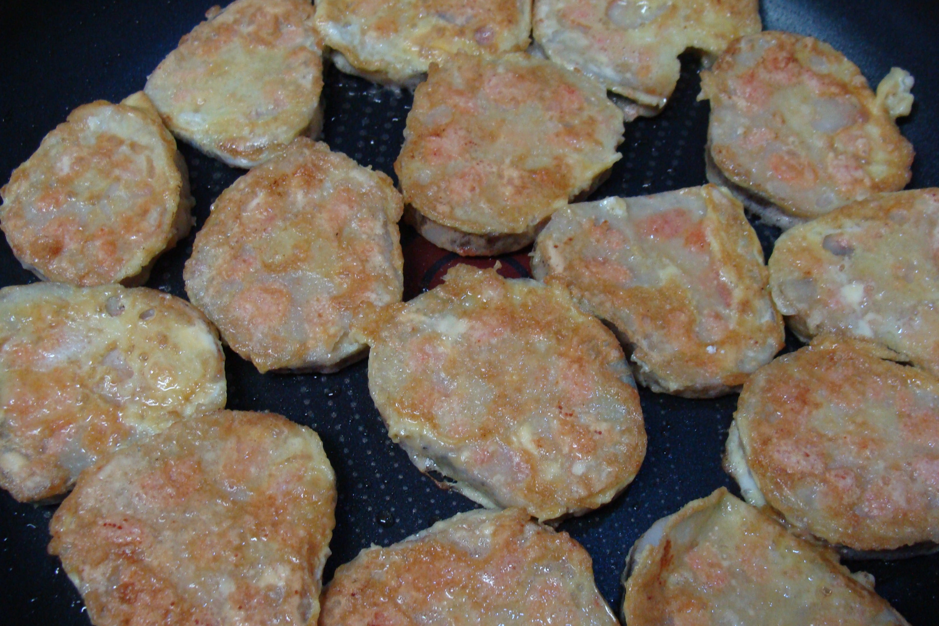 밀가루 묻힌 연근을 계란물에 퐁당퐁당