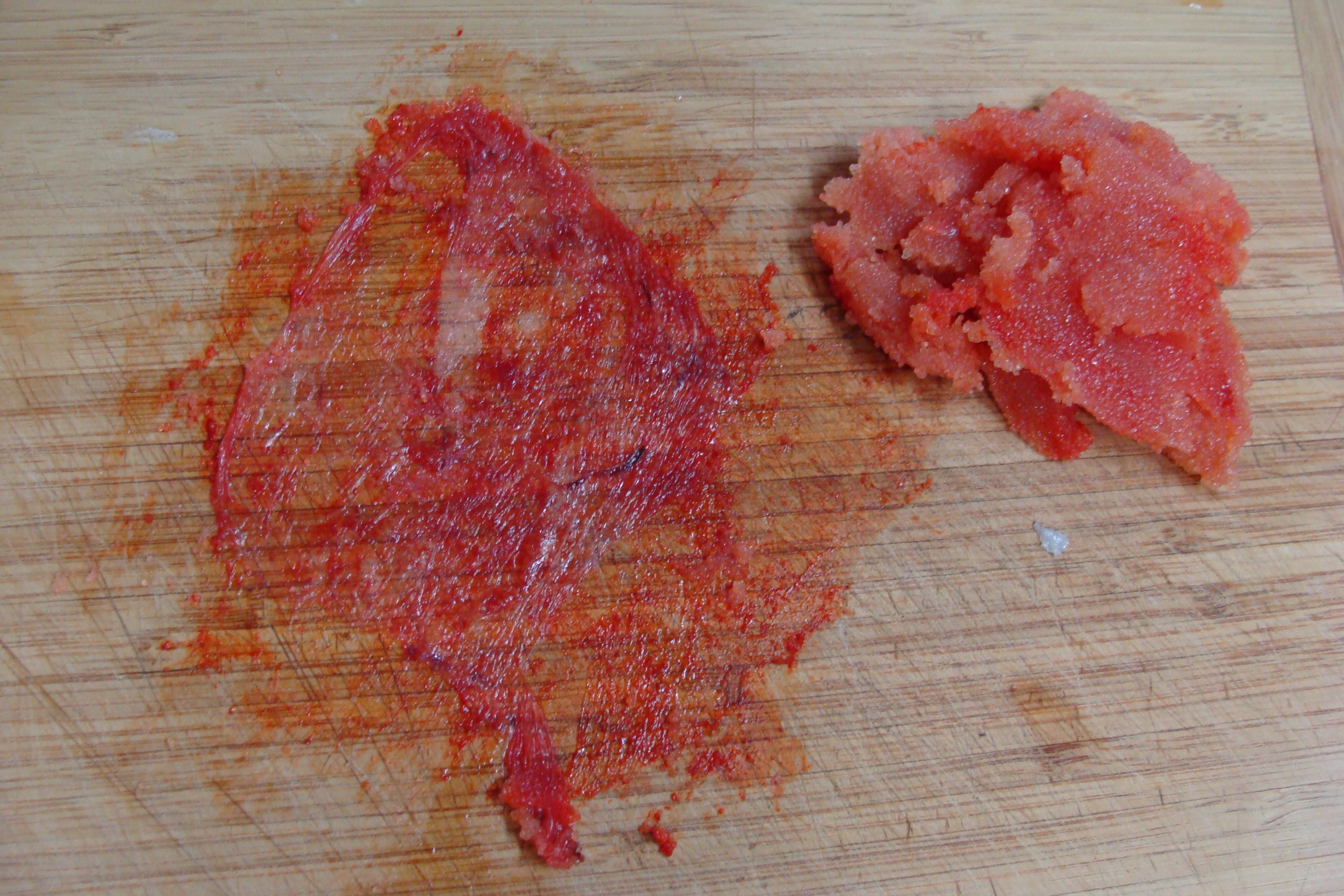 명란젓을 칼로 반 가르고 알만 칼등으로 슥슥 긁어서